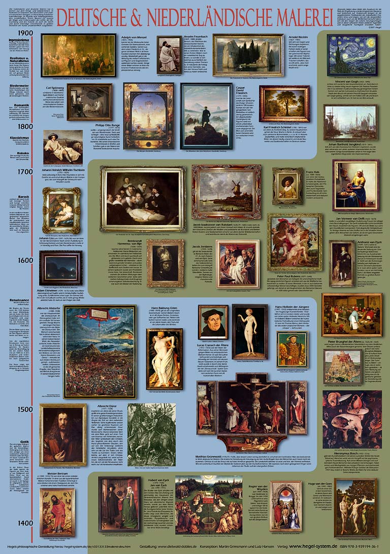 31 Kurzbiografien der bedeutendsten deutschen und niederländischen Maler mit ihren berühmtesten Werken werden vorgestellt. Eine Zeitleiste hilft, die Künstler den verschiedenen Kunstepochen, deren wesentliche Merkmale angegeben werden, zuzuordnen.